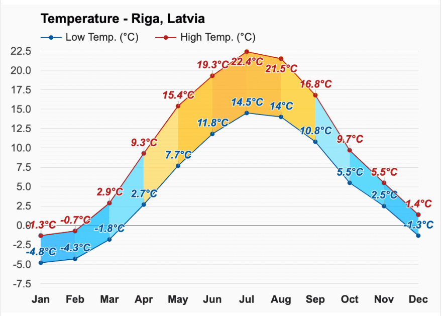 - The climate of Riga is humid continental (Köppen Dfb).[63] The coldest months are January and February, when the average temperature is −5 °C (23 °F), but temperatures as low as −20 to −25 °C (−4 to −13 °F) can be observed almost every year on the coldest days.